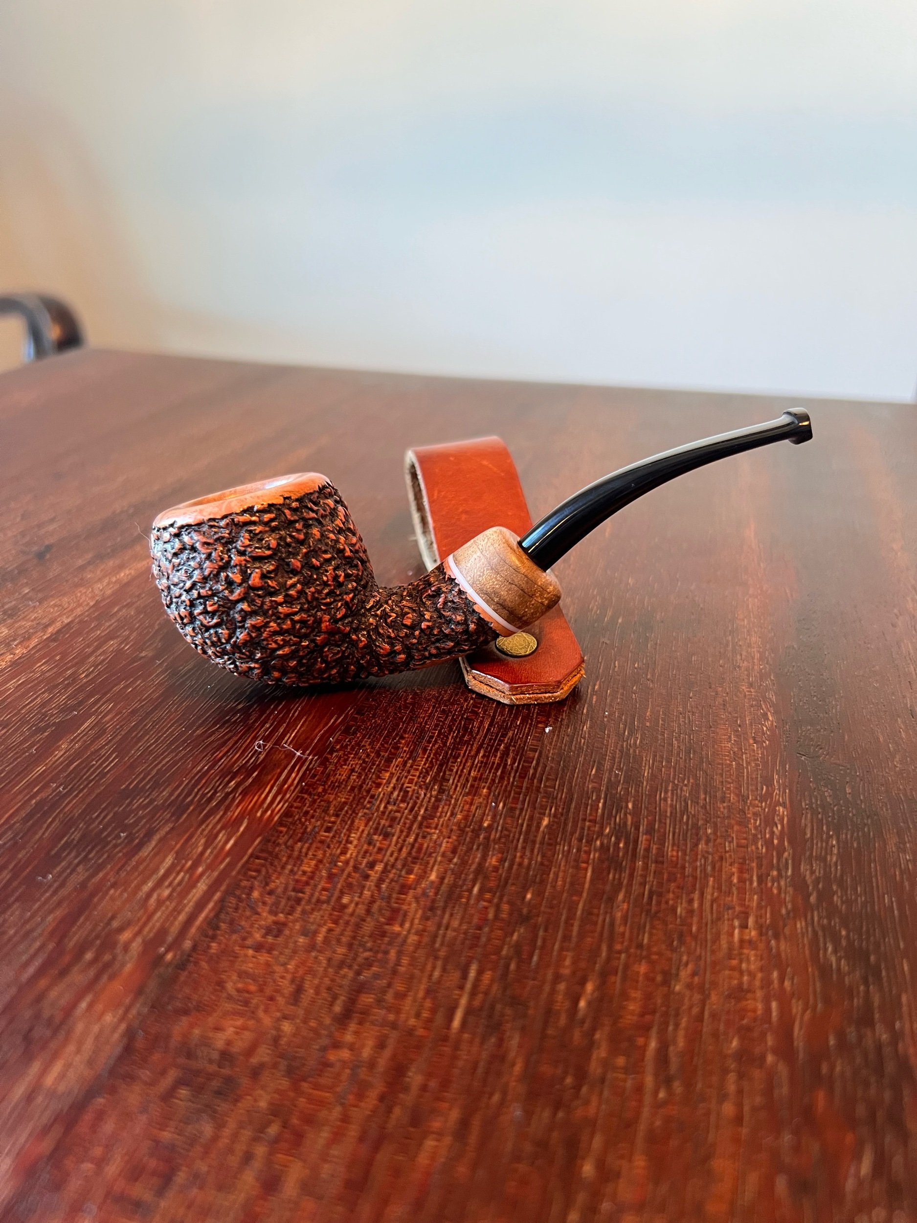 This rusticated, bent author marks two firsts for me as a pipemaker. My first shank accent, and my first bowl coating. Shank accent is myrtlewood and ivorite, the bowl coating is food safe - and if you prefer raw briar, it can be wiped out with a wet rag. The fishtail stem is hand cut from black ebonite.